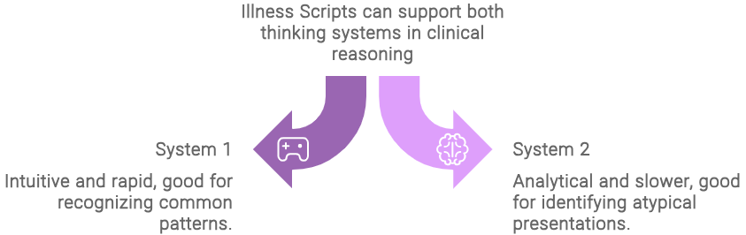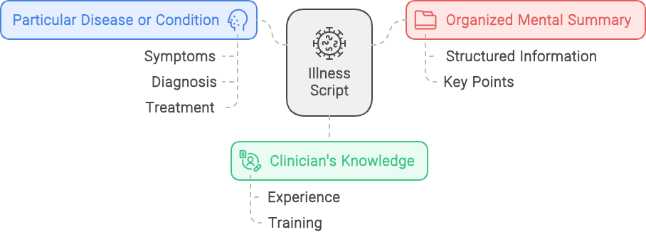 In essence, illness scripts are a cognitive tool that allows clinicians to efficiently organize, retrieve, and apply their medical knowledge in clinical practice. They play a crucial role in the development of clinical expertise and diagnostic reasoning skills.